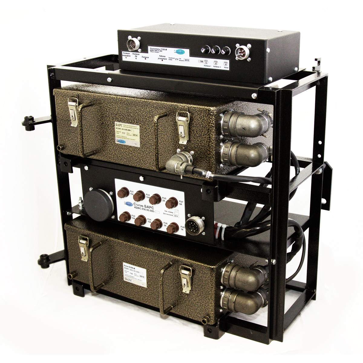 В междублочном пространстве расположены разъемы для подключения вагонного кабеля, контрольные разъемы, блок предохранителей, жгуты с разъемами для подключения блоков БАРС и БУМ. В верхней части статива предусмотрена возможность расположения усилителя У-100М (ИДФС.066.01.000) и кронштейна для расположения разъема цепей оповещения.